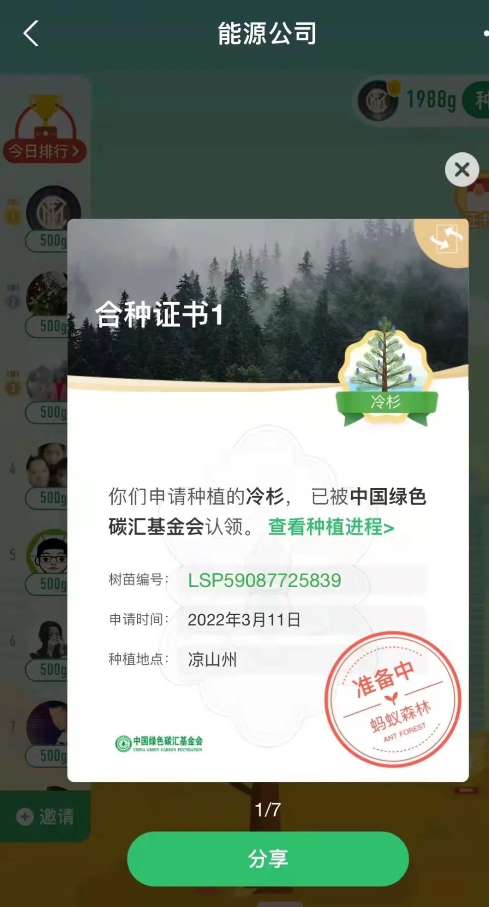 “一花一草皆生命,一枝一葉總關(guān)情。”早在2019年起,公司就通過(guò)支付寶螞蟻森林組建了一只“能源公司云種樹(shù)小隊(duì)”,如今隊(duì)伍人數(shù)越來(lái)越壯大,已有59位隊(duì)員,截止目前,在酒泉、大理、邯鄲等地,種下了冷杉、側(cè)柏、云杉、胡楊等7棵大樹(shù)。3月11日,在小伙伴的共同努力下,我們又種下了一棵冷杉樹(shù),該樹(shù)被中國(guó)綠色碳匯基金會(huì)認(rèn)領(lǐng),將種植到?jīng)錾街莸貐^(qū)。